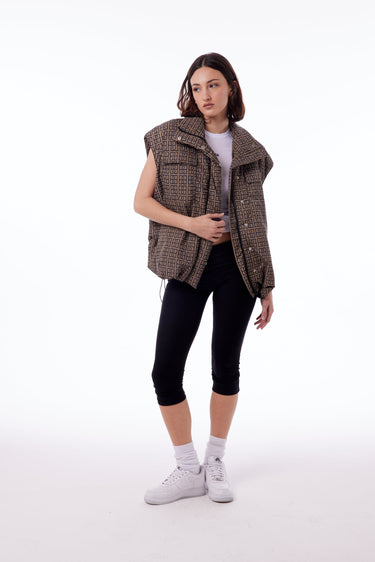 Chaleco puffer impermeable. Estampa celebrity. Forrado con tafeta negra. Tiene dos bolsillos frontales, bolsillos laterales ocultos, cierre desmontable, broches snap y elástico ajustable con tanca en ruedo.